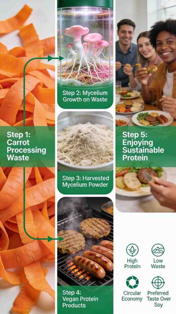 Carrot protein does not come directly from carrots. It is made by growing edible fungi on carrot waste. As the fungi grow, they form a structure called mycelium, which is rich in protein. This mycelium is then used as a protein source.